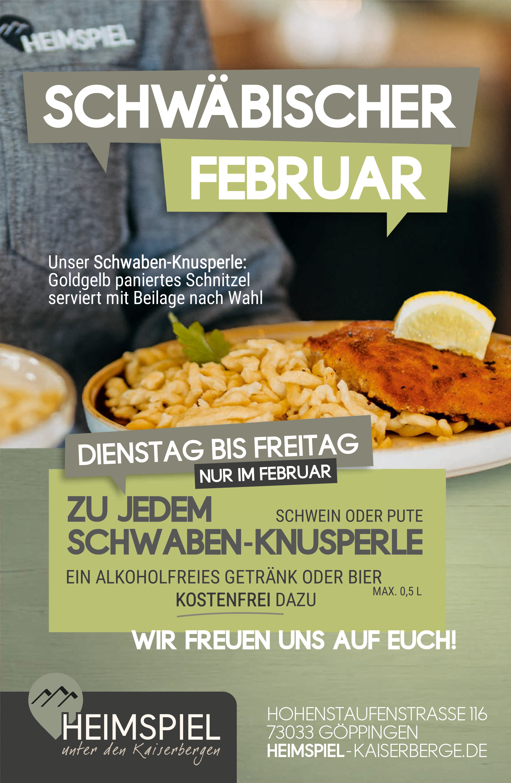 „Heimspiel unter den Kaiserbergen“ verbindet Tradition mit Moderne. Direkt am Gelände des 1. Göppinger Sportvereins gelegen, stehen bei uns nicht nur Fußball und Gemeinschaft im Mittelpunkt, sondern auch ehrliche, gehobene schwäbische Küche mit Pfiff.